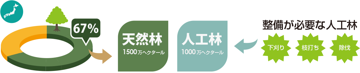日本は国土面積の67%を森林が占める世界有数の森林大国です。