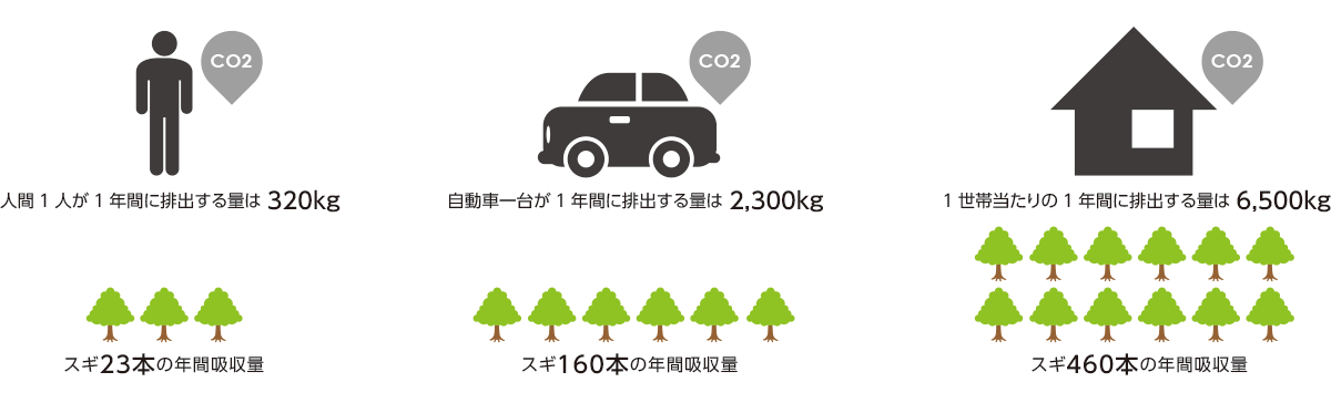 例えば、自家用乗用車1台から1年間に排出される二酸化炭素の量は、80年生のスギ人工林約0.3ha(スギ約160本)の年間吸収量と同じくらいです。 また、1世帯から1年間に排出される二酸化炭素の量は、80年生のスギ人工林約0.8ha(スギ約460本)の年間吸収量と同じくらいです。 我が国の森林が1年間に蓄える二酸化炭素の量は約8,300万トン(平成18年度)程度と考えられます。