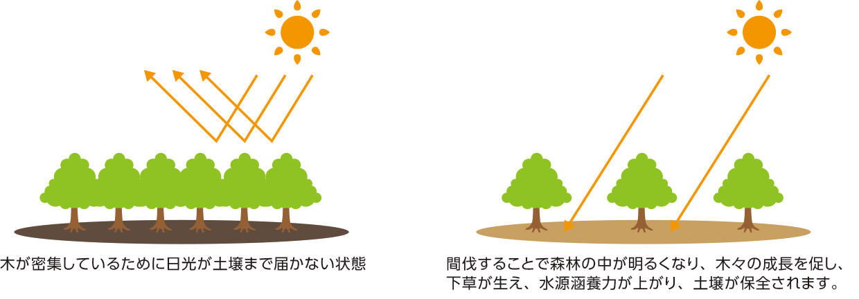 人工林は、良質な木材供給を行うために、適切な手入れを行うことで、樹木が健全に育ちます。 植栽された樹木は、下刈り、枝打ち、除伐と保育作業を行うことで、競争しながら、まっすぐに育っていきます。順調に生長し、20~30年くらいたつと、林の中は混み合ってきます。 混み合ったまま放置しておくと樹木はひょろひょろともやし状となり、病害虫にも弱い木となってしまいます。