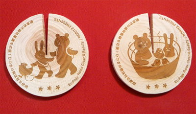 森林カーボンオフセットサービスをご利用いただく企業様には、森林整備により搬出される間伐材を利用したノベルティをご利用いただけます。森林環境の保全への取り組みを視覚など五感で感じていただくようにPRすることができます。