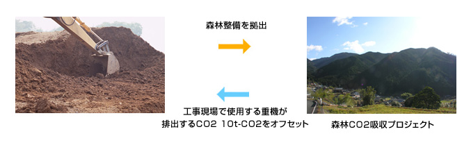 CO2削減の取り組みとして、工事現場にて使用する重機が排出するCO2をカーボンオフセットするために森林カーボンオフセットサービスを利用します。
