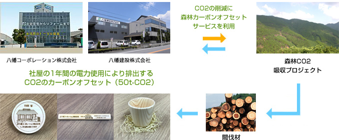 八幡建設株式会社、八幡コーポレーション株式会社の社屋の1年間の電力使用により排出するCO2の削減に森林カーボンオフセットサービスを利用します。