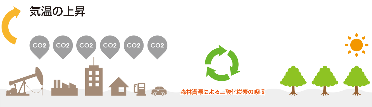 森林は、その森林面積を維持し、植栽、保育、間伐、伐採、そして再植林という適切な森林管理を継続することで、単年度ごとのCO2排出抑制対策に比べて、永続性があり、循環型社会の構築に寄与することができます。