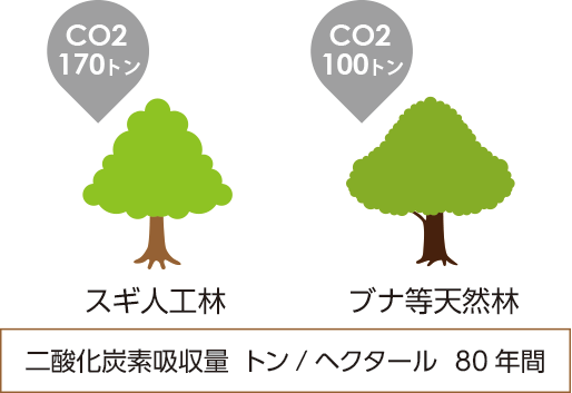 スギ人工林は1ha当たり約170t(1年間当たり平均で約2.1t)、同じく80年生のブナを主体とする天然林は1ha当たり約100t(1年間当たり平均で約1.3t)程度の炭素を蓄えていると推定されます。