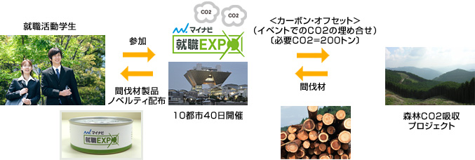 マイナビ就職EXPO 2011年卒対象実施会場(10都市40日開催)の電力使用によるCO2排出(200t-CO2)に対して森林カーボンオフセットサービスを利用します。