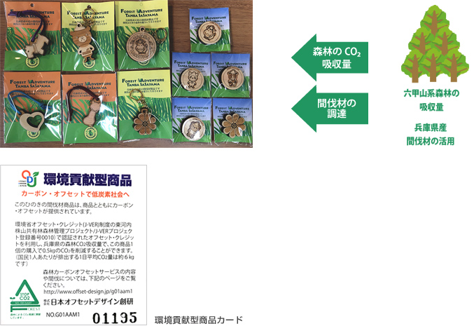 | 排出削減利用量 | 桧のキーホルダー及び、マグネット、コースターなど2000個を1個につき0.5㎏のCO2をオフセット |